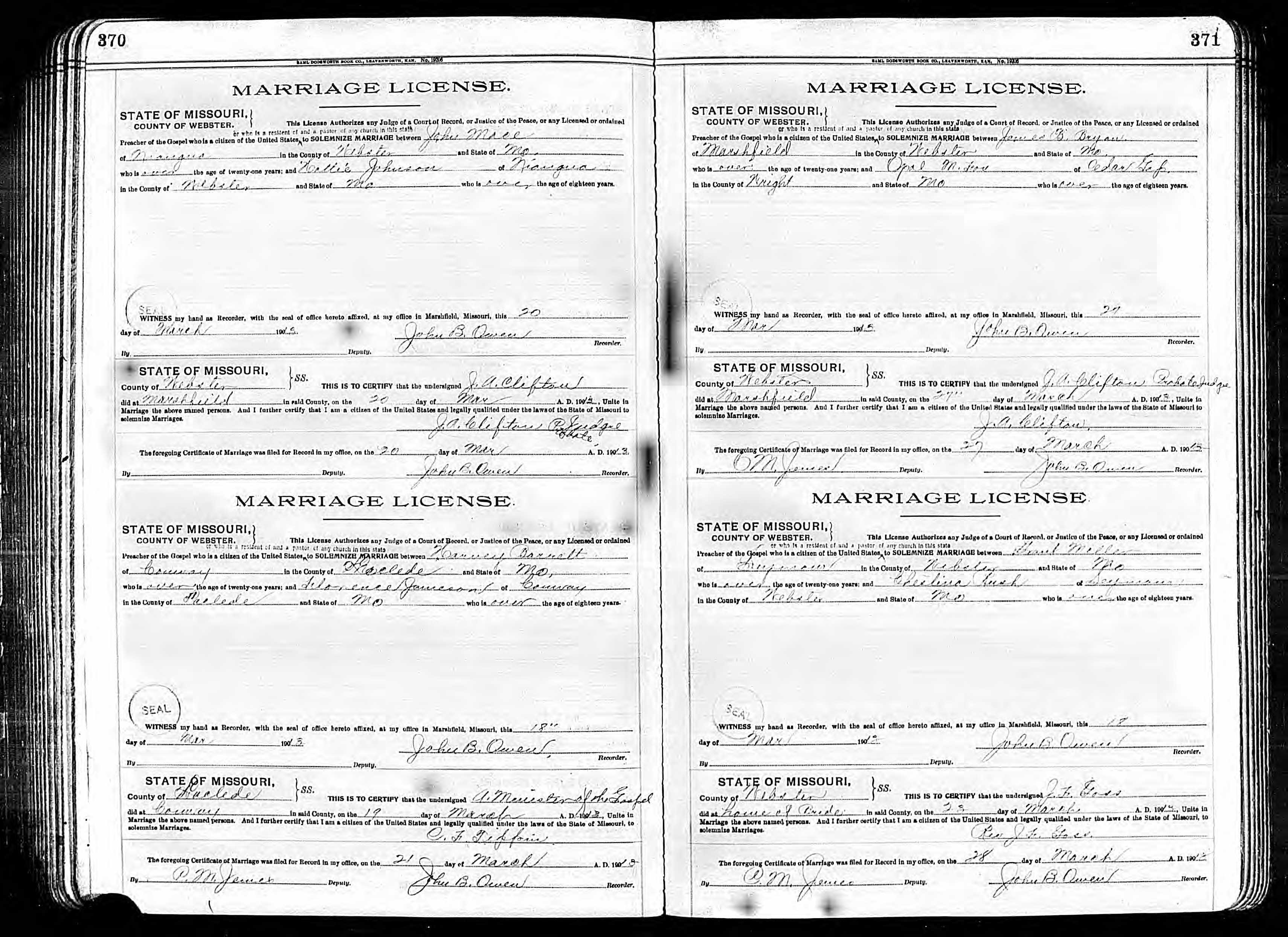Missouri Marriage Record, Harvey Barrett and Florence Jameson