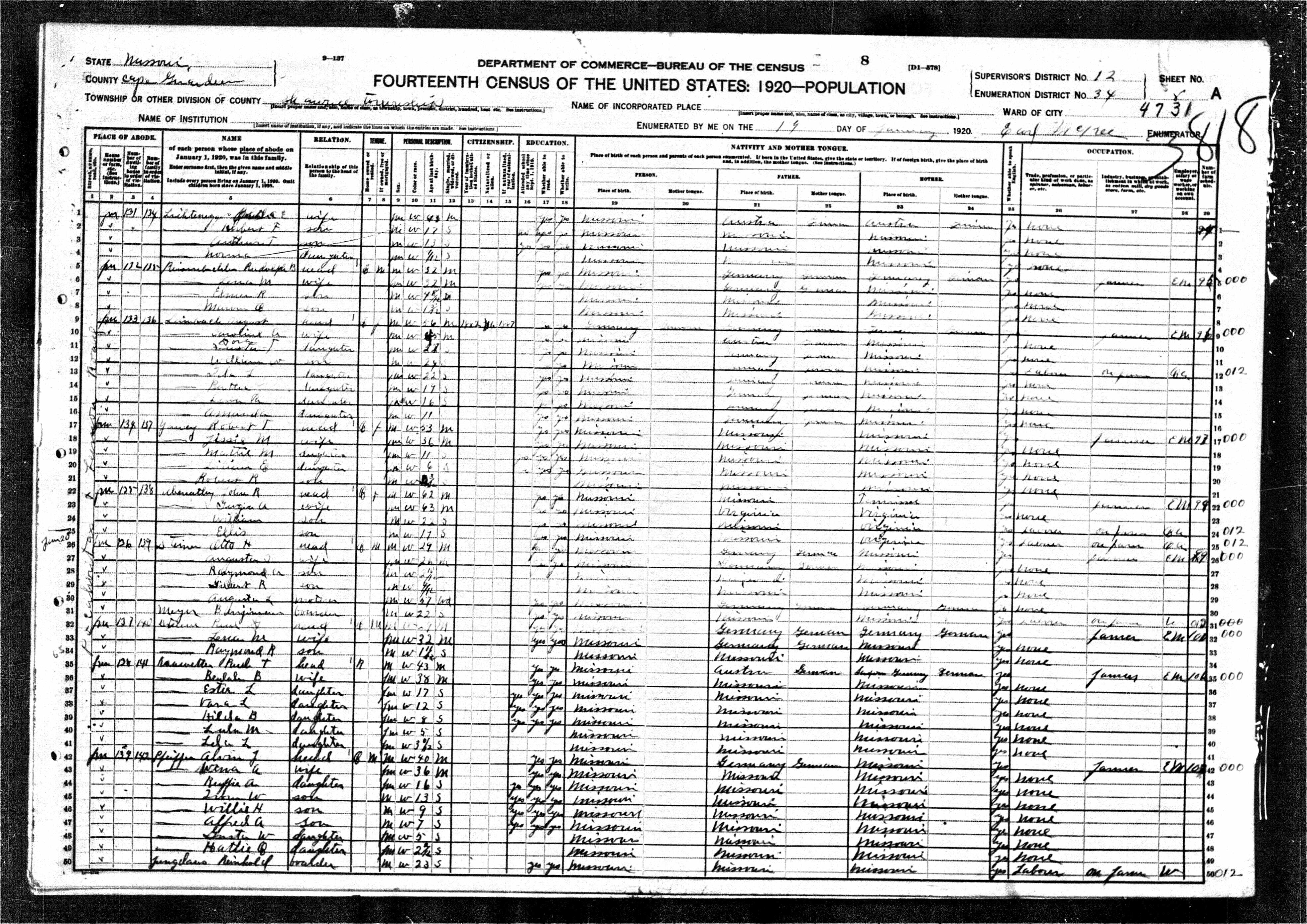 Missouri, Supervisor's District 12, Enumeration District 34, Sheet 8A, Lines 17-21