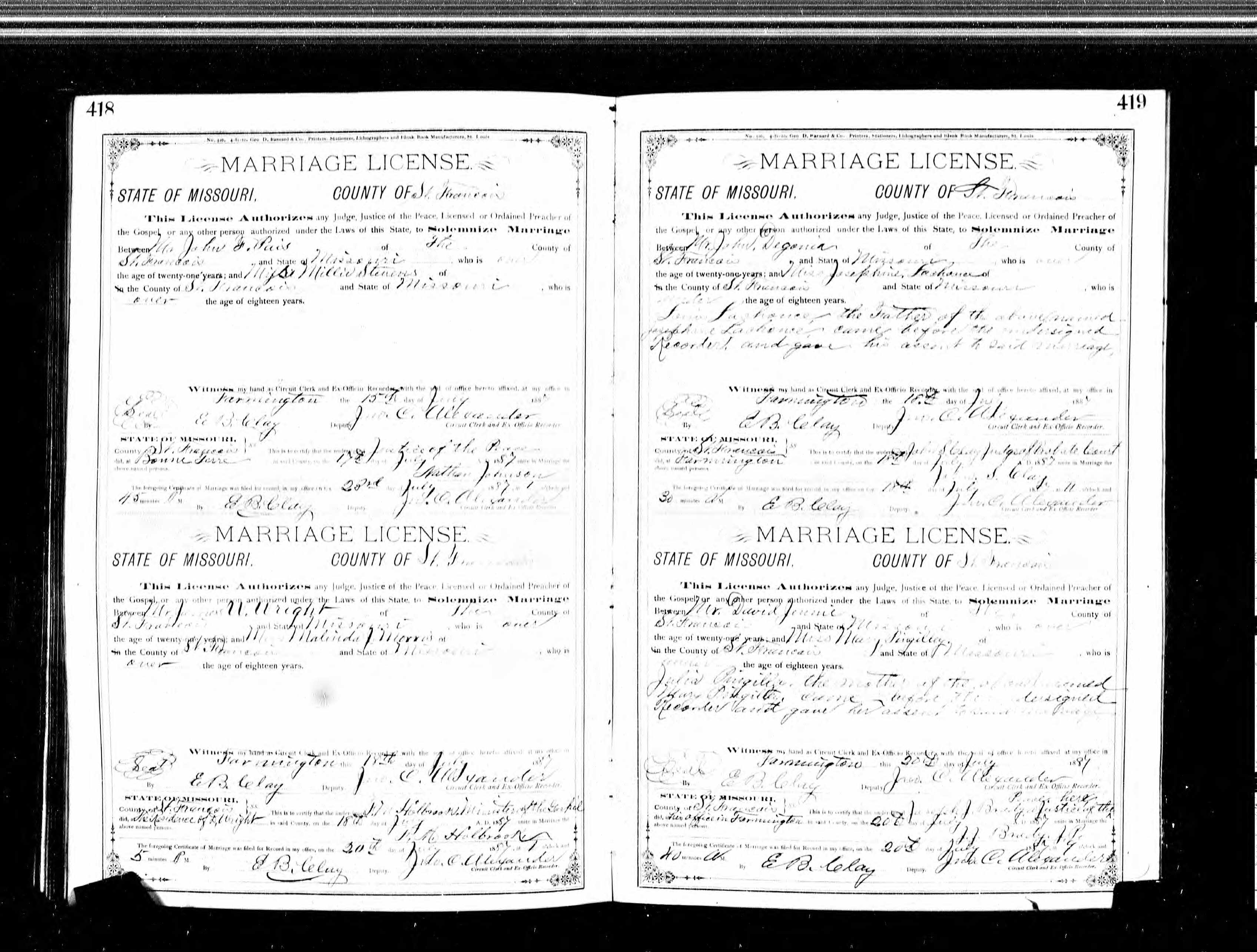 Missouri Marriage Record, James W. Wright and Malinda J. Morris