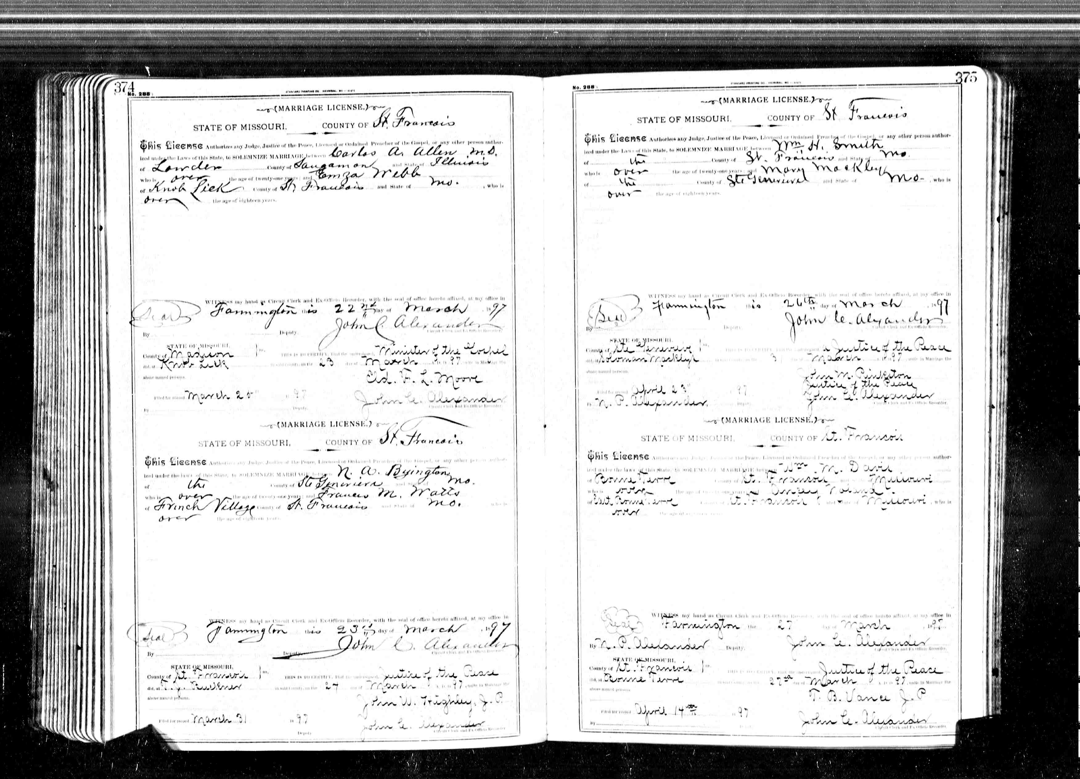 Missouri Marriage Records, N. A. Byington and Frances M. Watts, William H. Smith and Mary Mackley