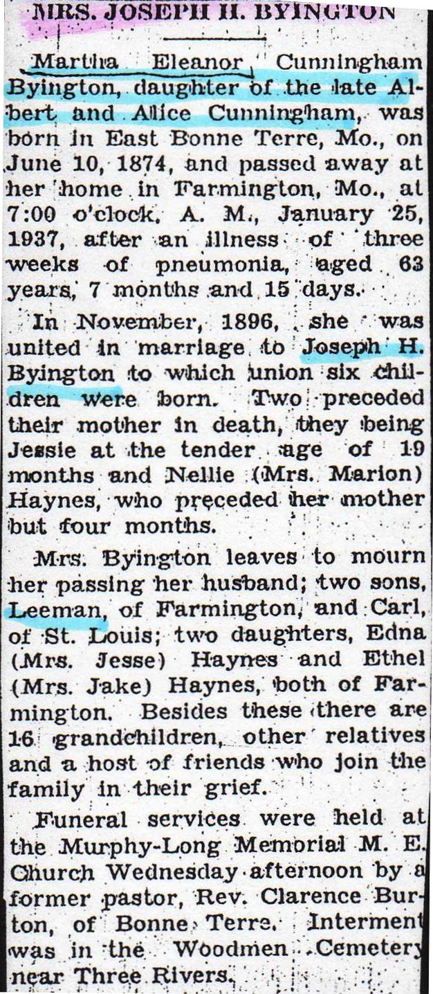 Obituary, Mrs. Joseph H. Byington