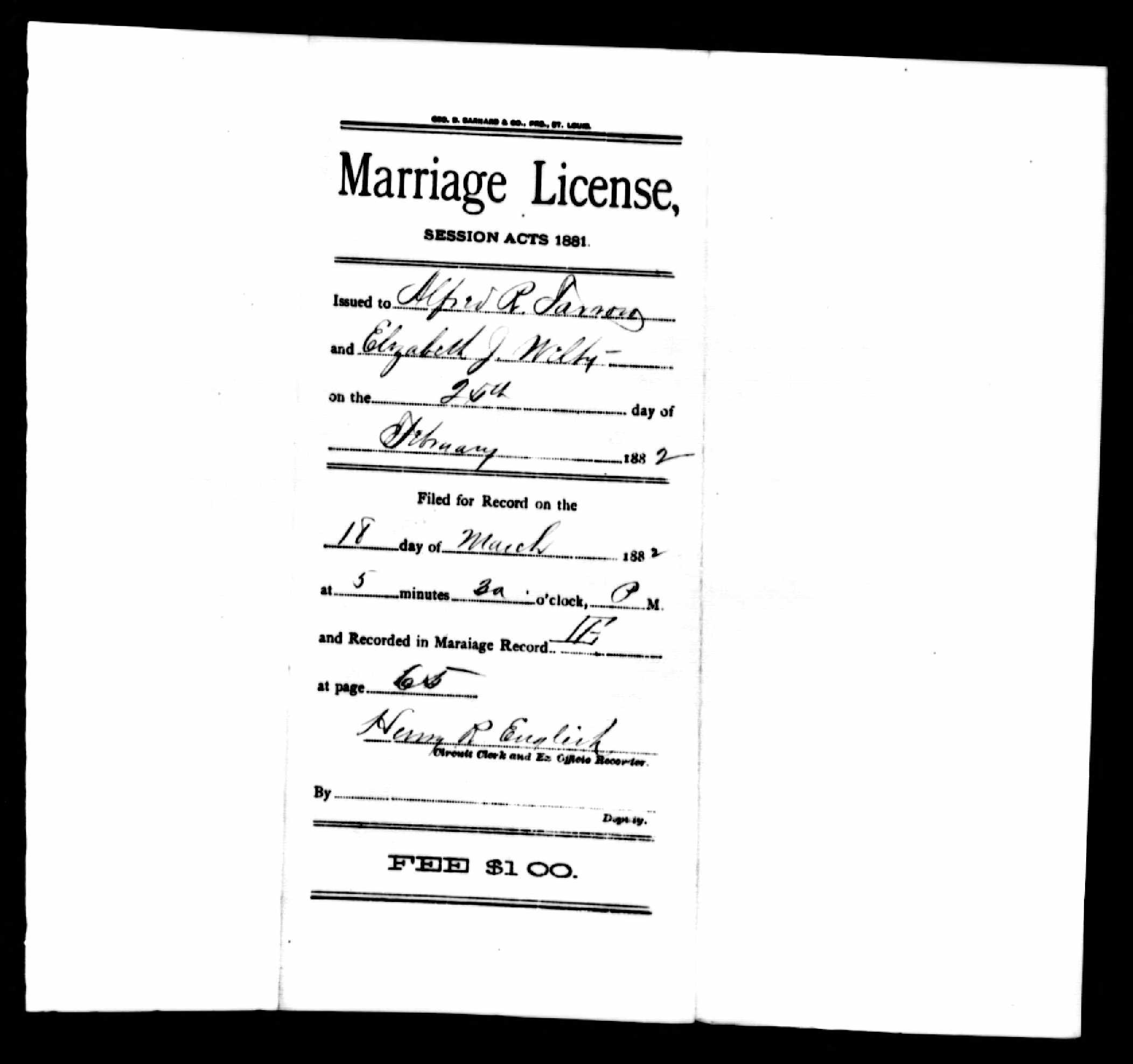 Missouri Marriage Record, Alfred R. Farrow and Elizabeth J. Welty