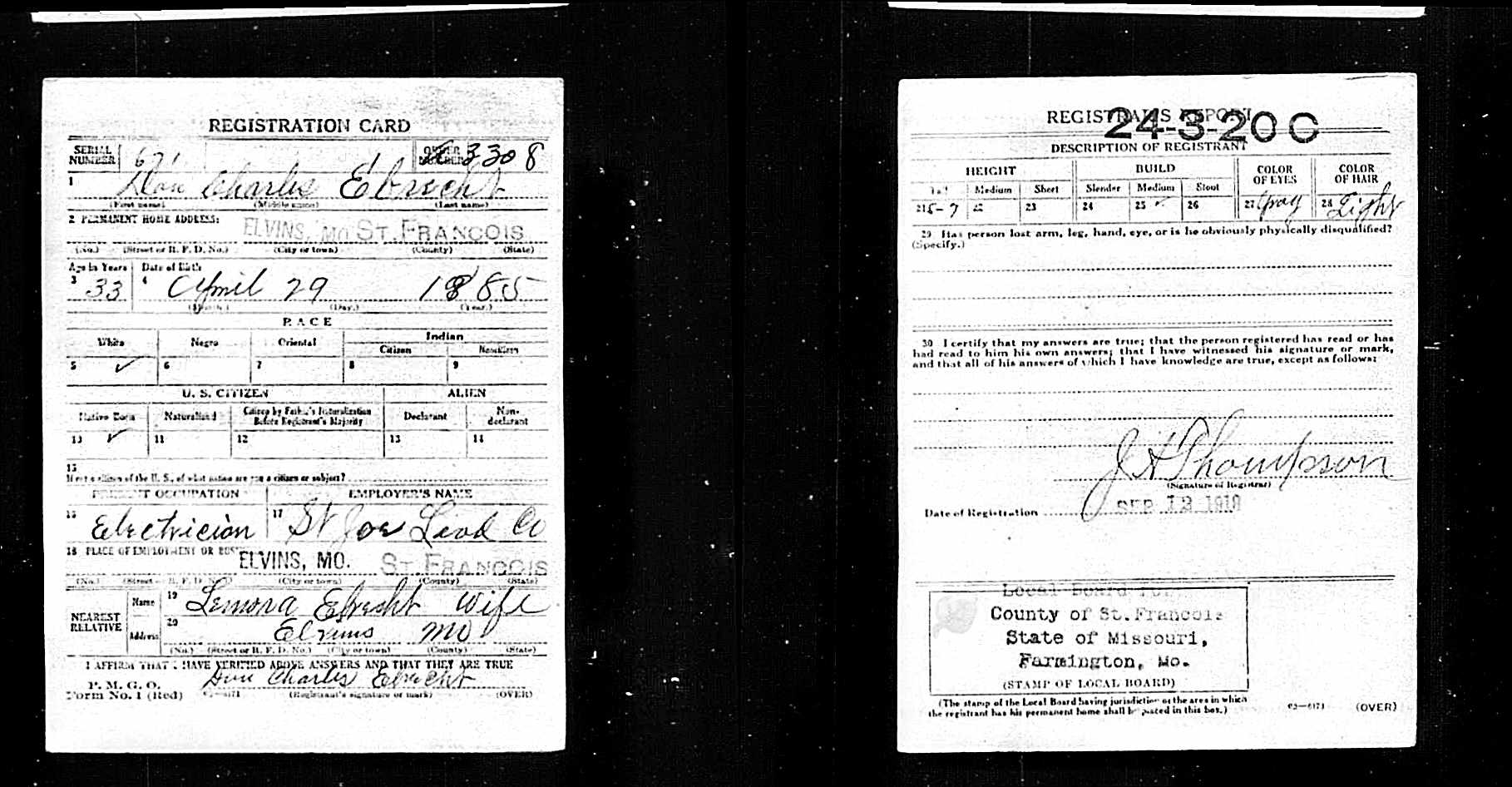 WWI Draft Registration, Dan Charles Ebrecht