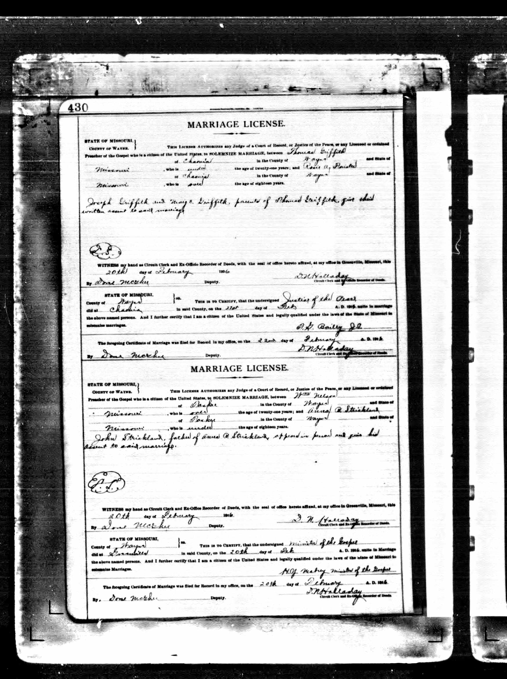 Missouri Marriage Record, William Nelson and Anna B. Strickland