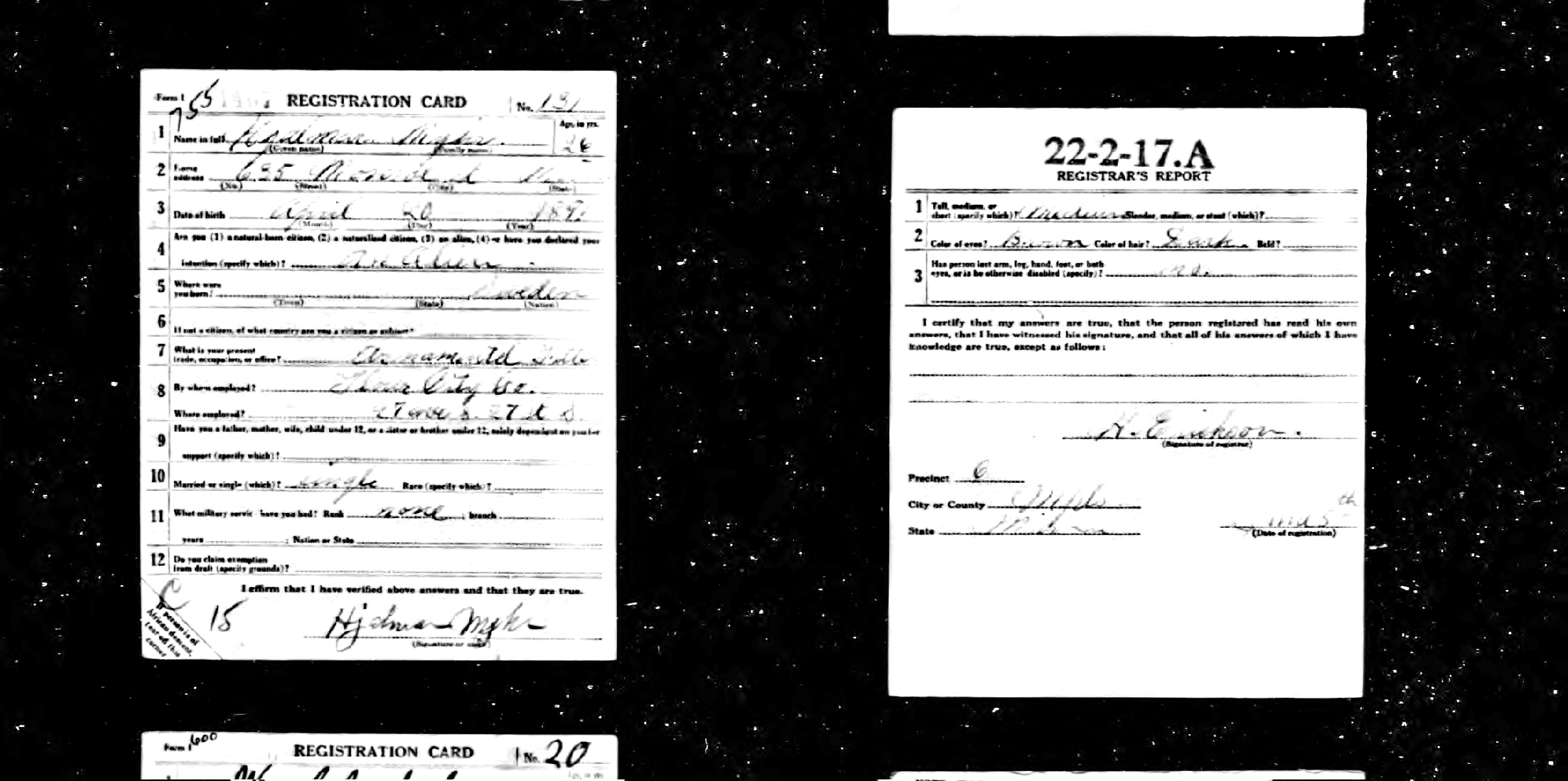 WWI Draft Registration, Hjalmar Myhr