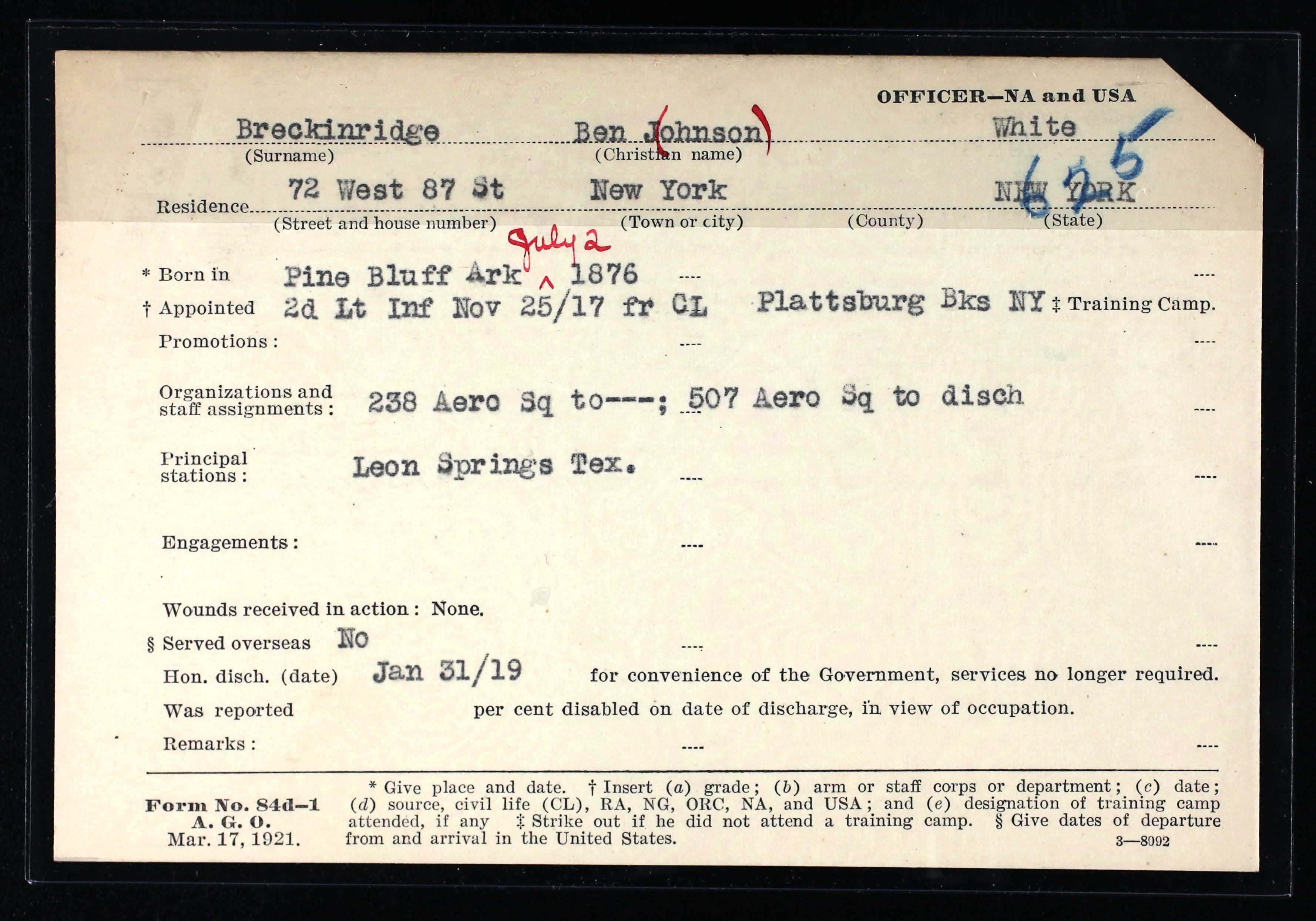 New York Abstracts of WWI Military Service, Ben Johnson Breckinridge