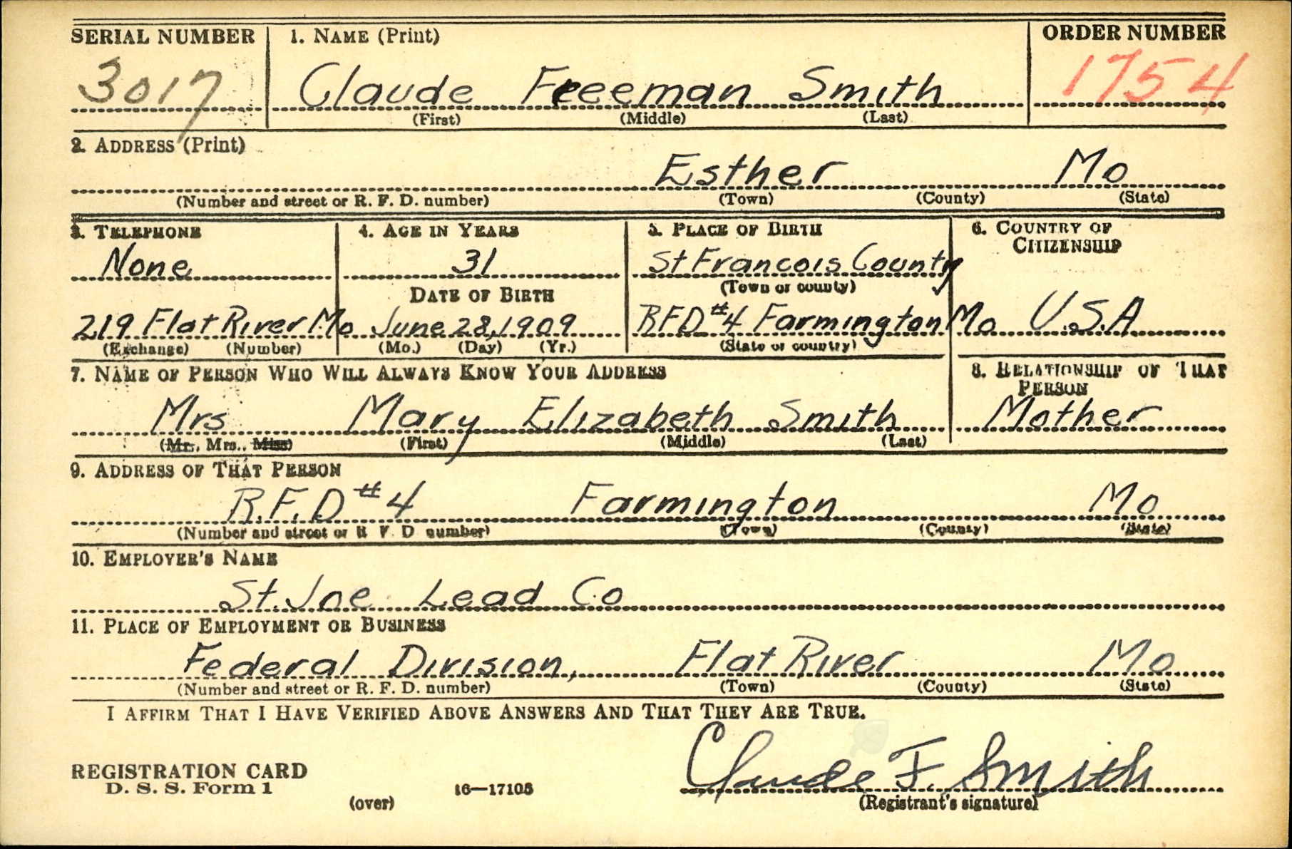 | Draft Registration | 16 Oct 1940 | Esther, Saint Francois, St. Francois, Missouri, United States of America | ||||||||||||||||||||||||||||||||||||||||||||||||||||||||||||||||||||||||||||||||||||||||||||||||||||||||||||||||||||||||||||||||||||||||||||