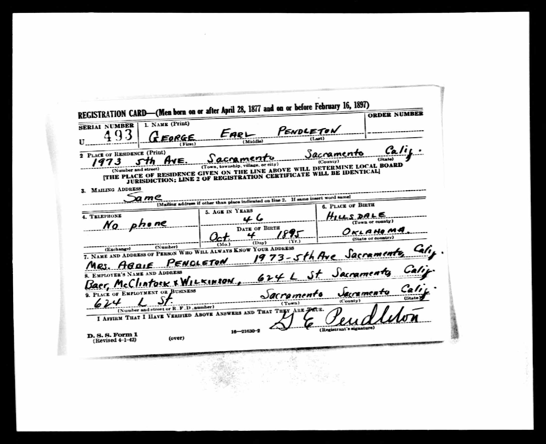 | Draft Registration | about 1942 | Sacramento, Sacramento, California, United States of America | ||