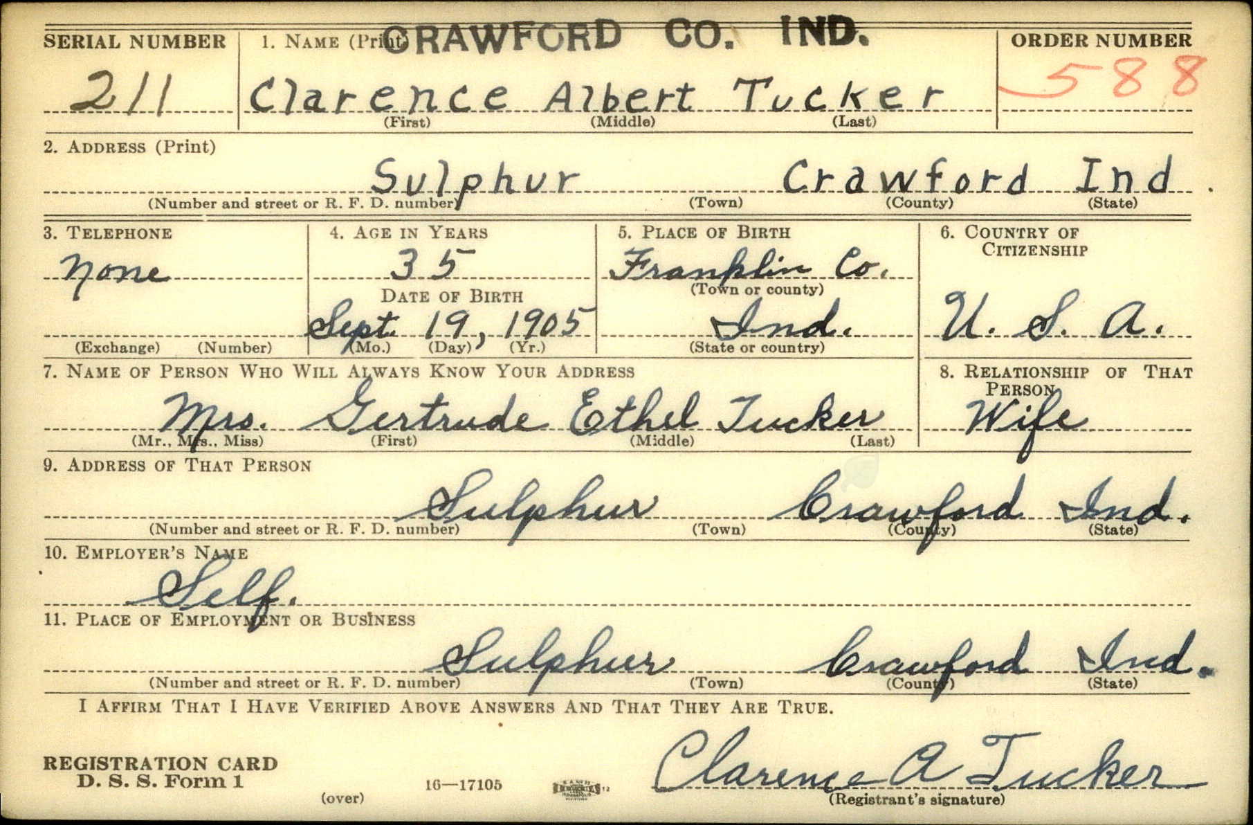 | Draft Registration | 16 Oct 1940 | Sulphur, Union, Crawford, Indiana, United States of America | ||
