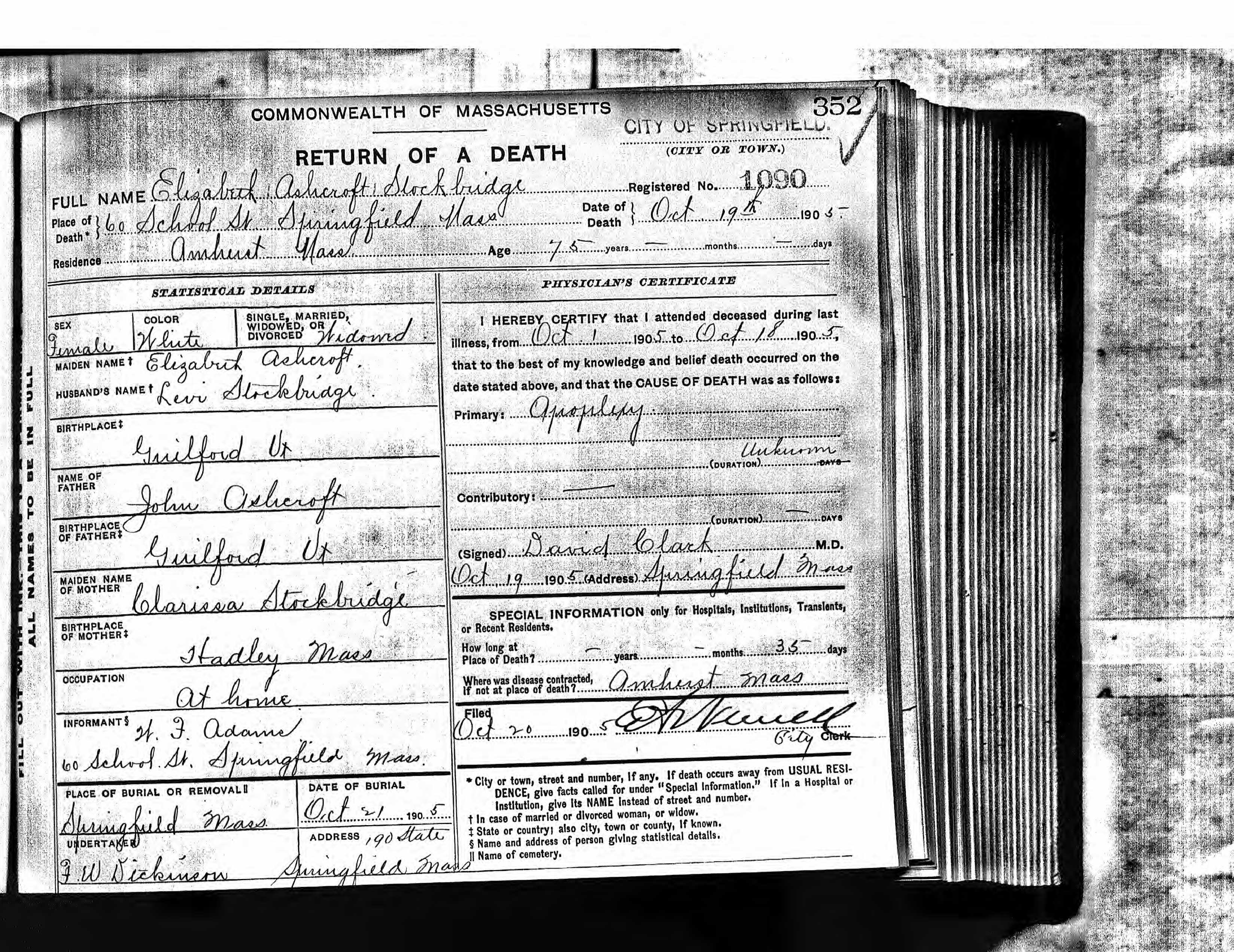 | Death | 19 Oct 1905 | Springfield, Hampden, Massachusetts, United States of America | ||
