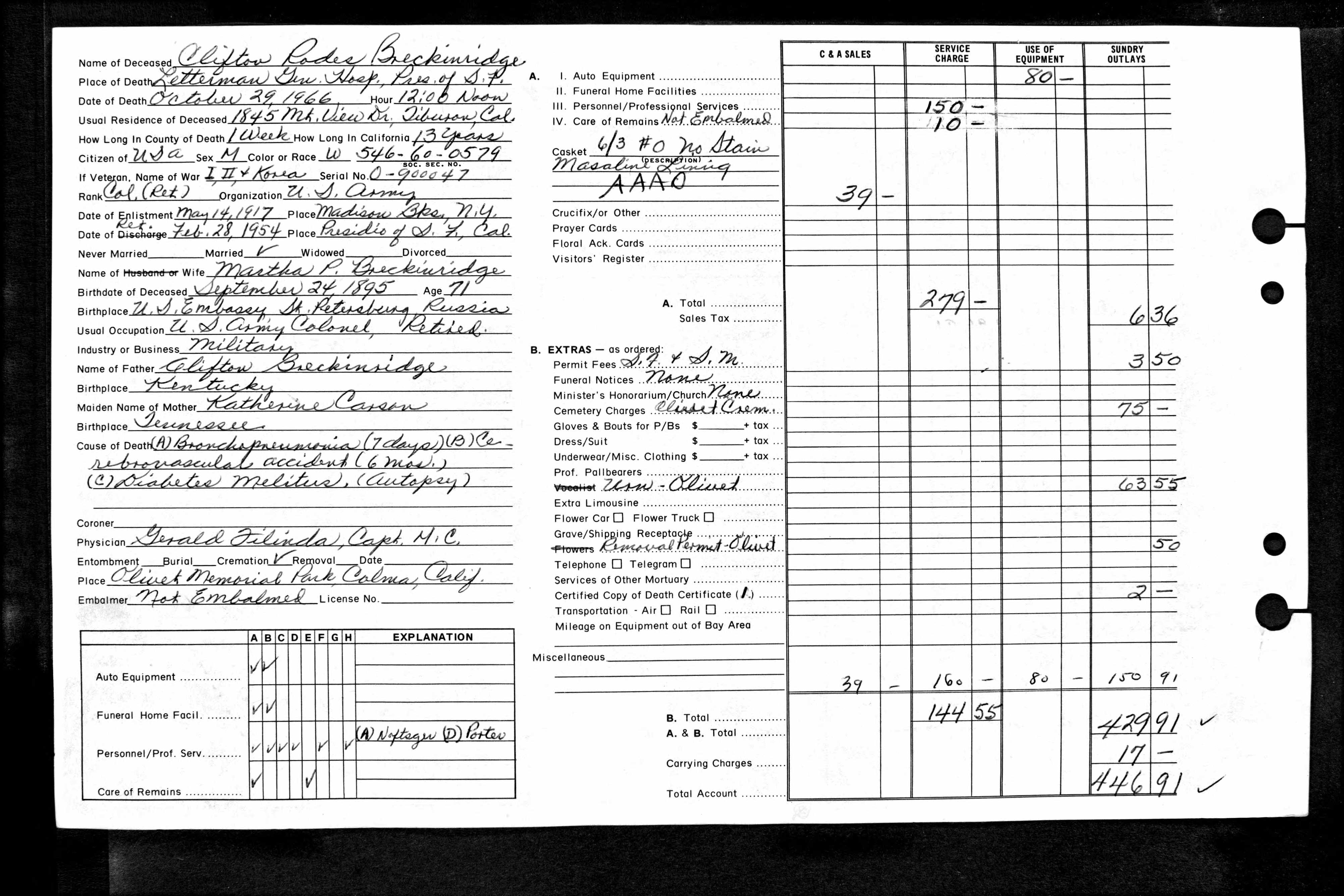 | Death | 29 Oct 1966 | Letterman General Hospital, San Francisco, San Francisco, California, United States of America | ||||||||||||||||||||||||||||||||||||||||||||||||||||||||||||||||||||||||||||||||||||||||||||||||||||||||||||||||||||||||||||||||||||||||||||||||||||||||||||||||