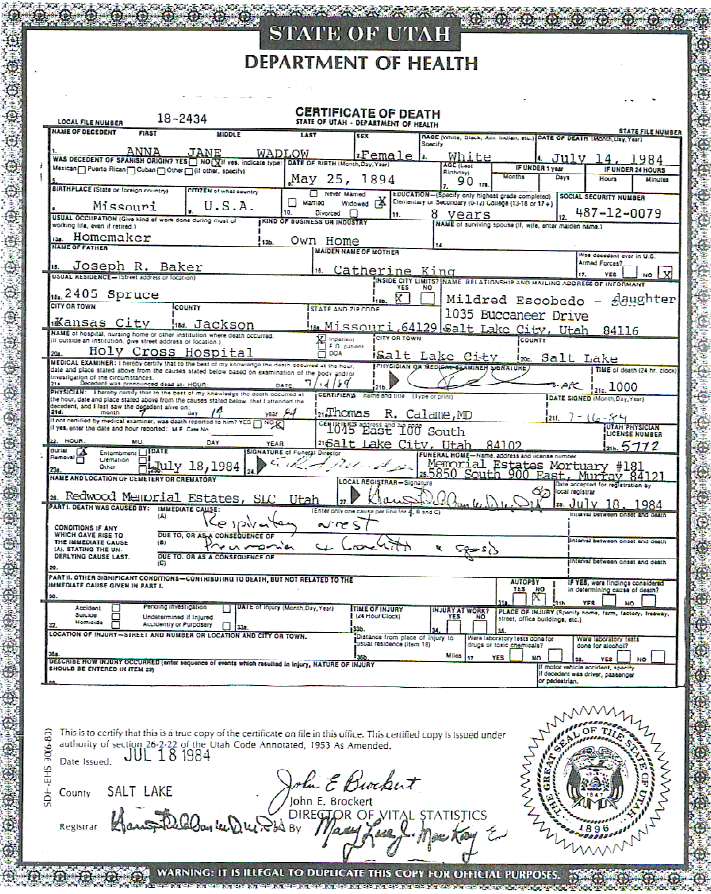 | Burial | 18 Jul 1984 | Redwood Memorial Cemetery, West Jordan, Salt Lake, Utah, United States of America | ||