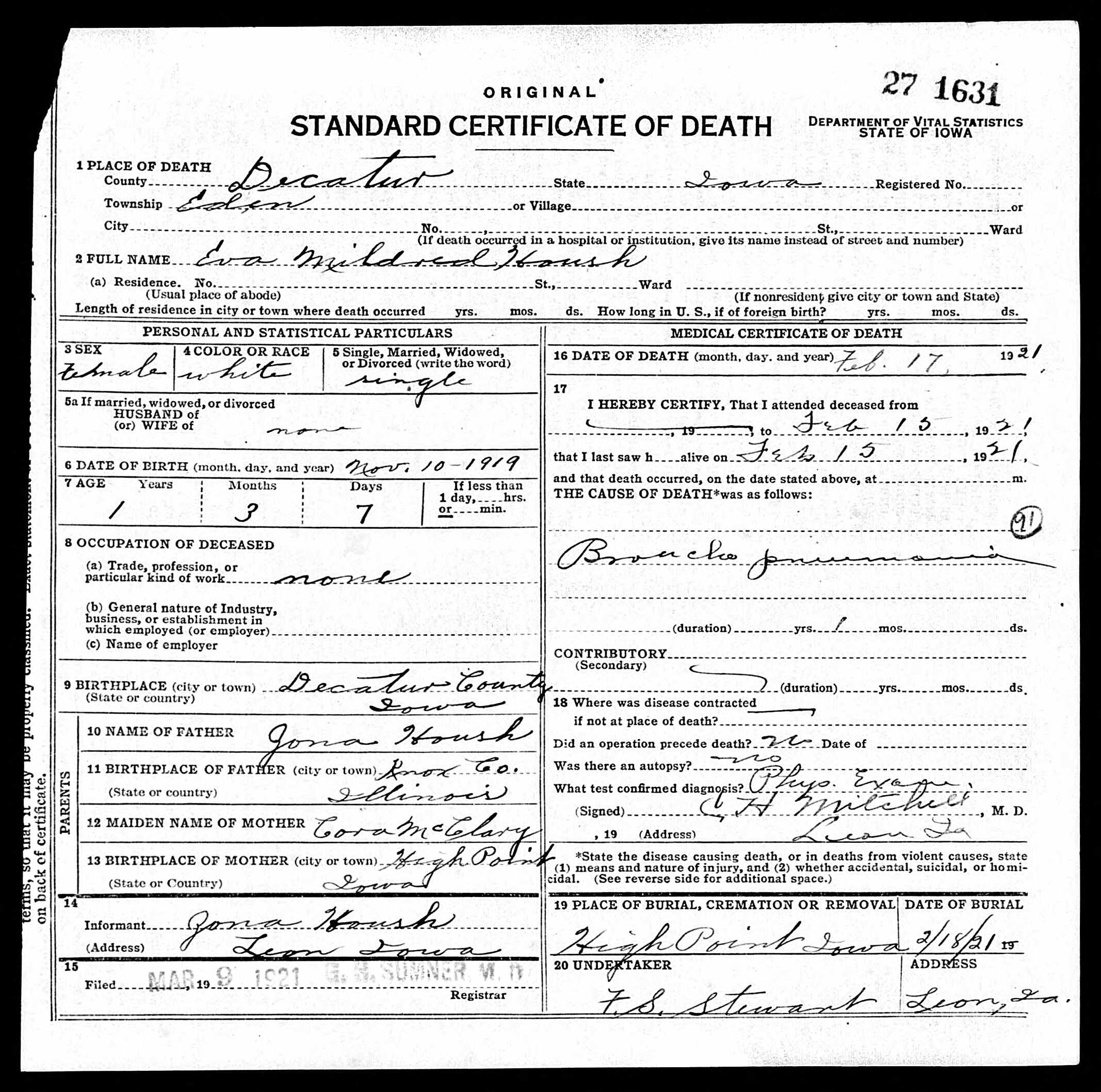 | Death | 17 Feb 1921 | Eden, Decatur, Iowa, United States of America | ||