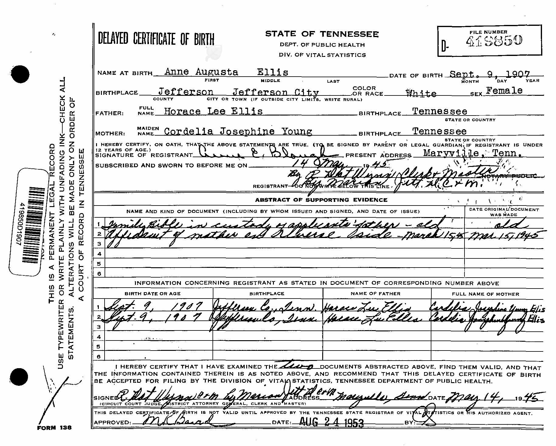 Place of birth of mother: Tennessee