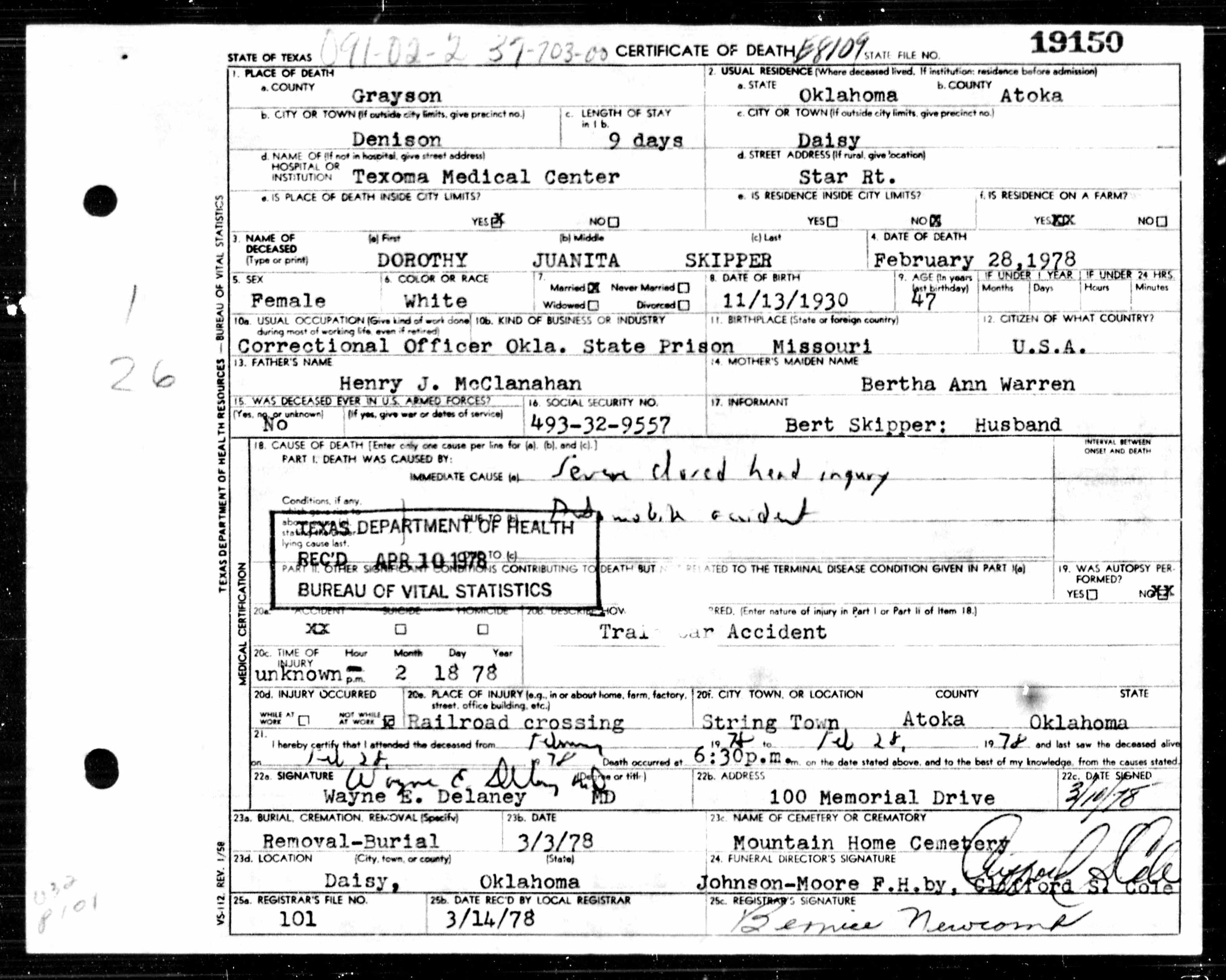 | Death | 28 Feb 1978 | Texoma Medical Center, Denison, Grayson, Texas, United States of America | |||||||||||||||||||||||||||||||||||||||||||||||||||||||||||||||||||||||||||||||||||||