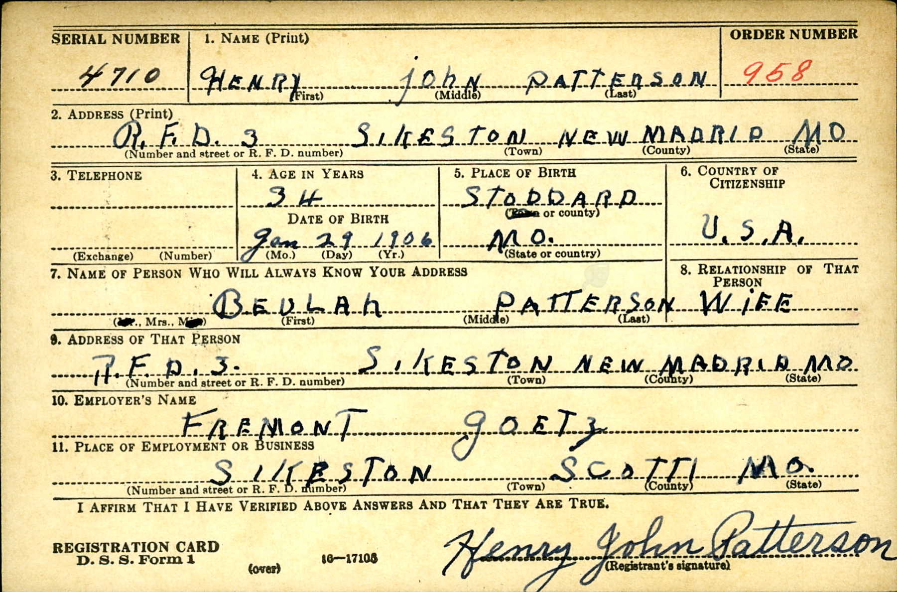 | Draft Registration | 16 Oct 1940 | New Madrid, Missouri, United States of America | ||