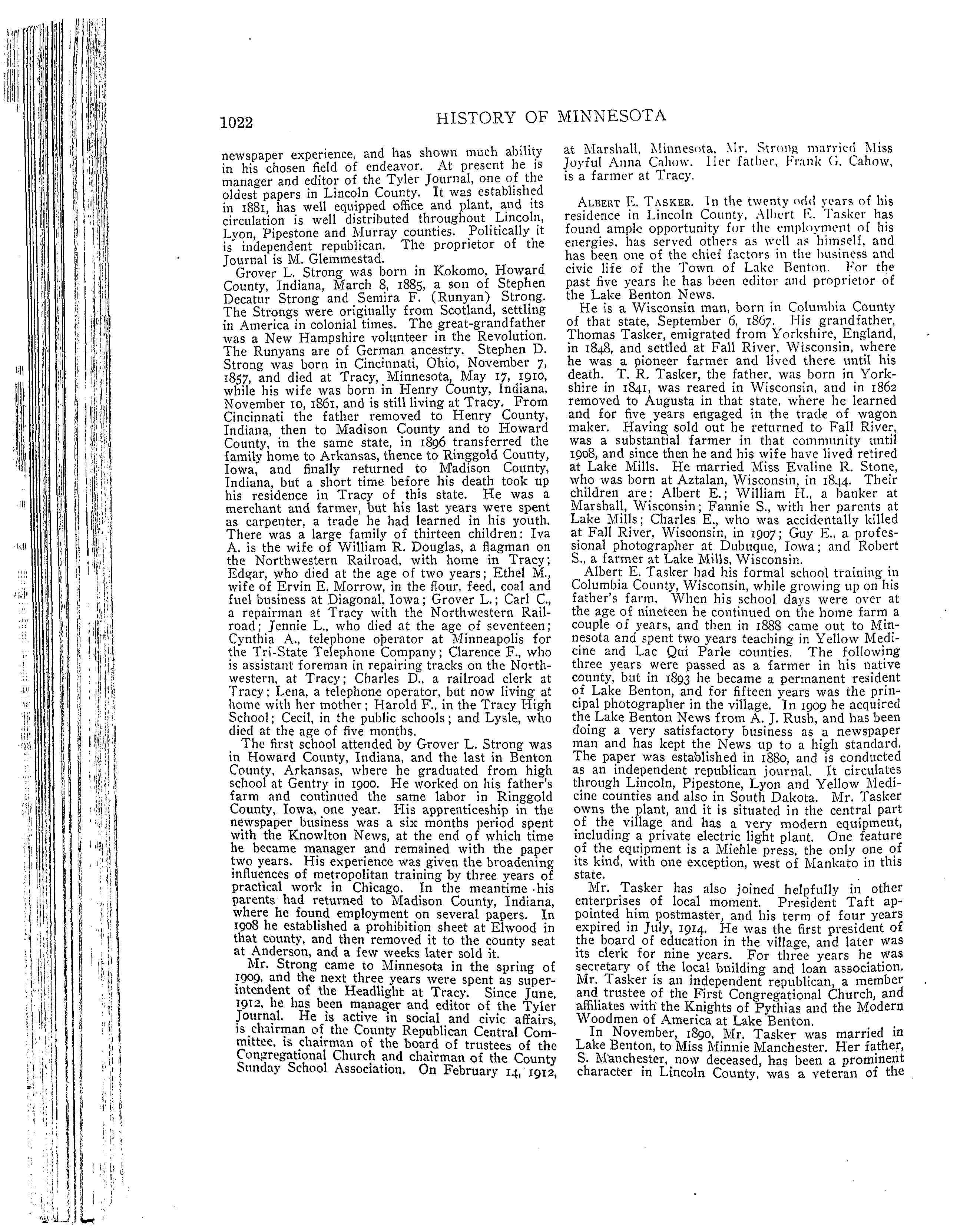 is assistant foreman in repairing tracks on the Northwestern, at Tracy; Charles D., a railroad clerk at Tracy; Lena, a telephone operator, but now living at home with her mother; Harold F., in the Tracy High School ; Cecil, in the public schools ; and Lysle, who died at the age of five months.The first school attended by Grover L. Strong was in Howard County, Indiana, and the last in Benton County, Arkansas, where he graduated from high school at Gentry in 1900. He worked on his father's farm and continued the same labor in Ringgold County, Iowa, one year. His apprenticeship in the newspaper business was a six months period spent with the Knowlton News, at the end of which time he became manager and remained with the paper two years. His experience was given the broadening influences of metropolitan training by three years of practical work in Chicago. In the meantime his parents had returned to Madison County, Indiana, where he found employment on several papers. In