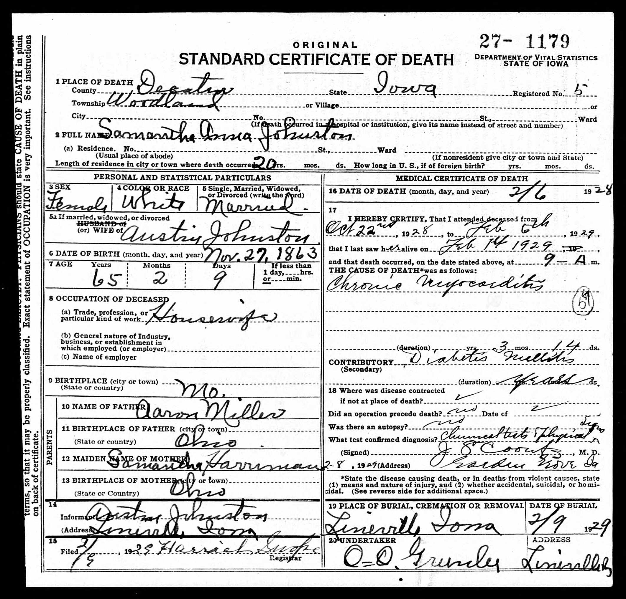 | Burial | 9 Feb 1929 | Evergreen Cemetery, Lineville, Wayne, Iowa, United States of America | ||||||||||||||||||||||||||||||||||||||||||||||||||||||||||||||||||||||||||||||||||||||||||||||||||||||||||||||||||||||||