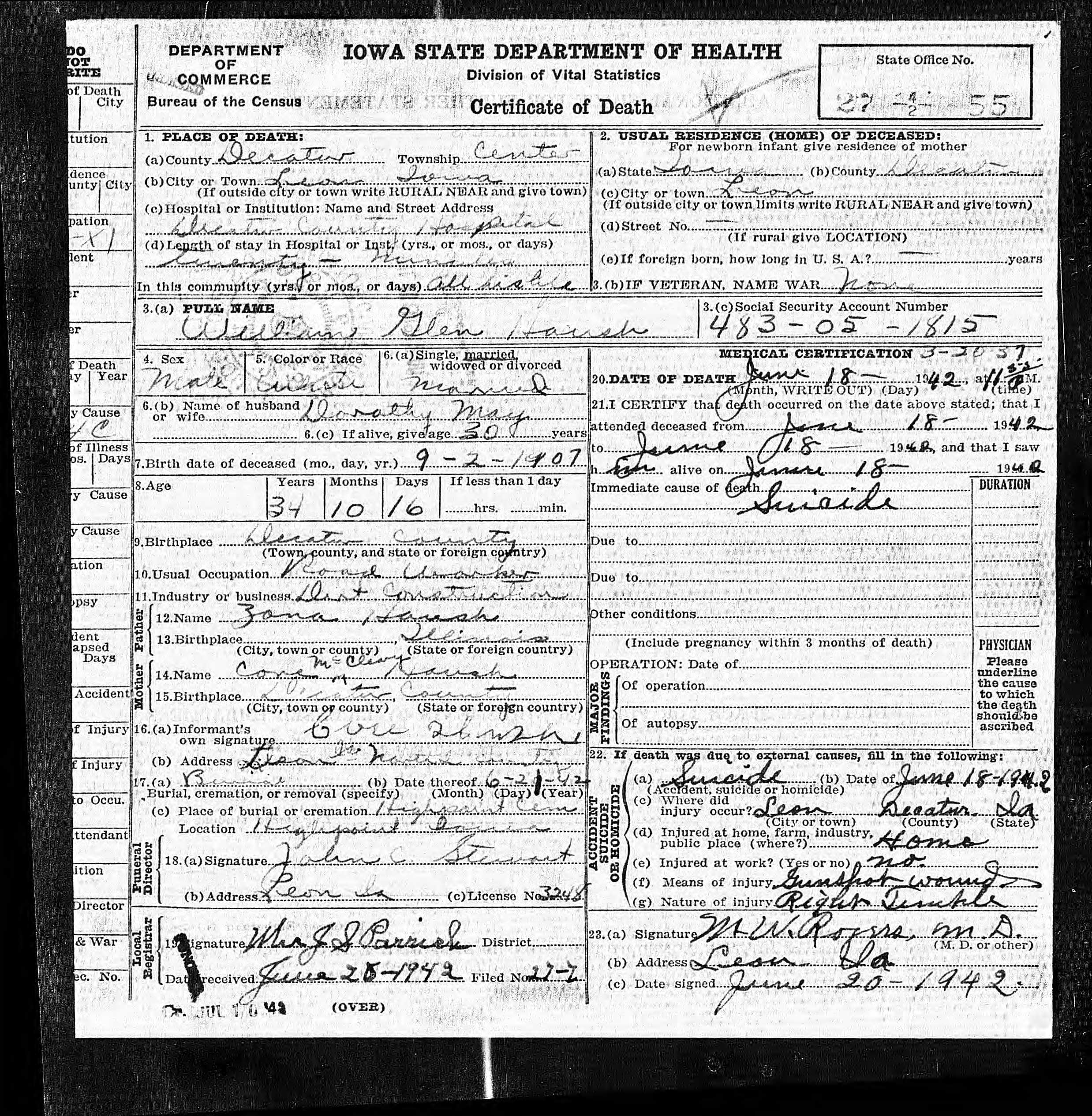 | Death | 18 Jun 1942 | Decatur County Hospital, Leon, Decatur, Iowa, United States of America | ||