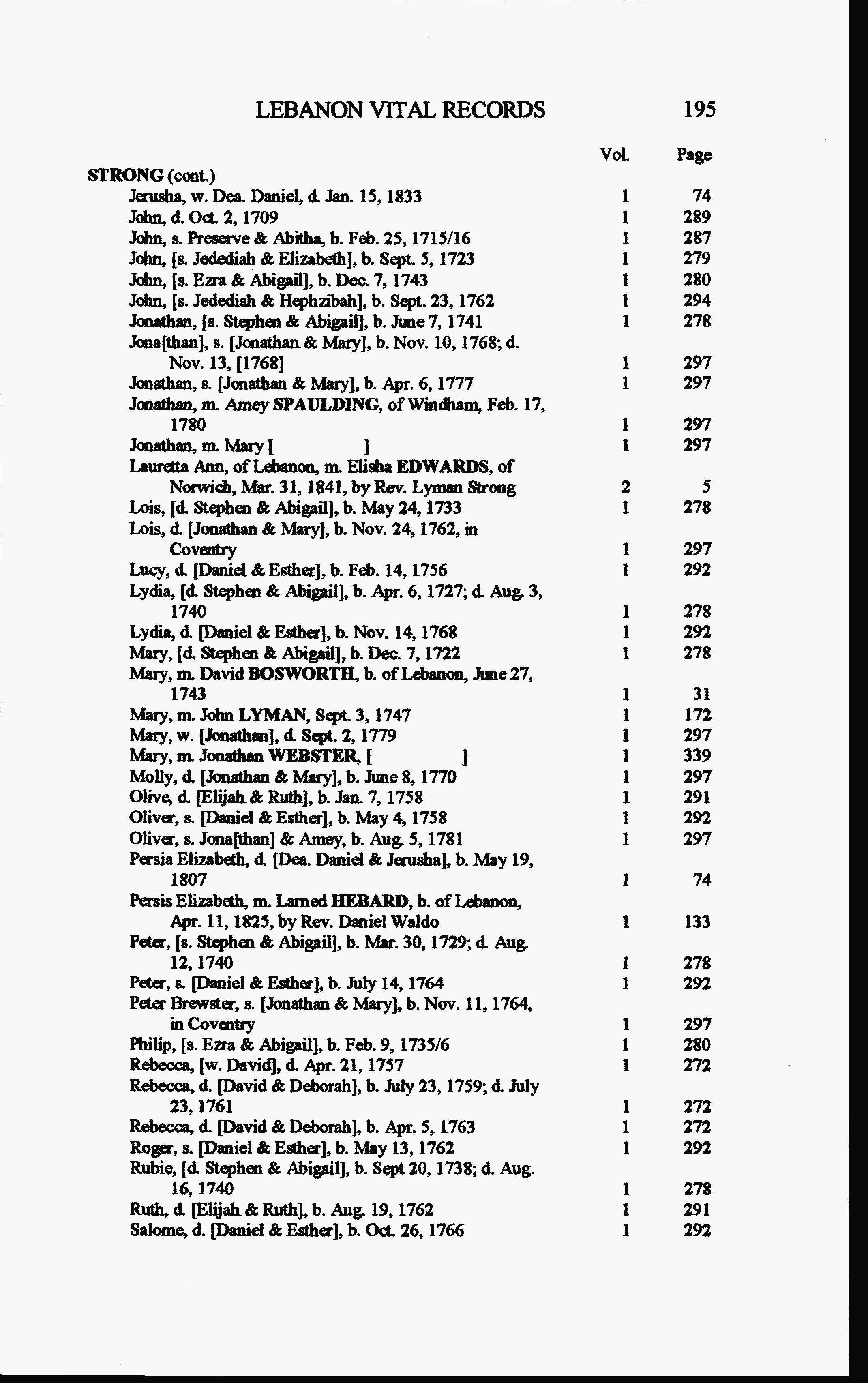 | Father | Strong, Ezra | 2 Mar 1701/2 (Julian) | 7 Mar 1785 | |