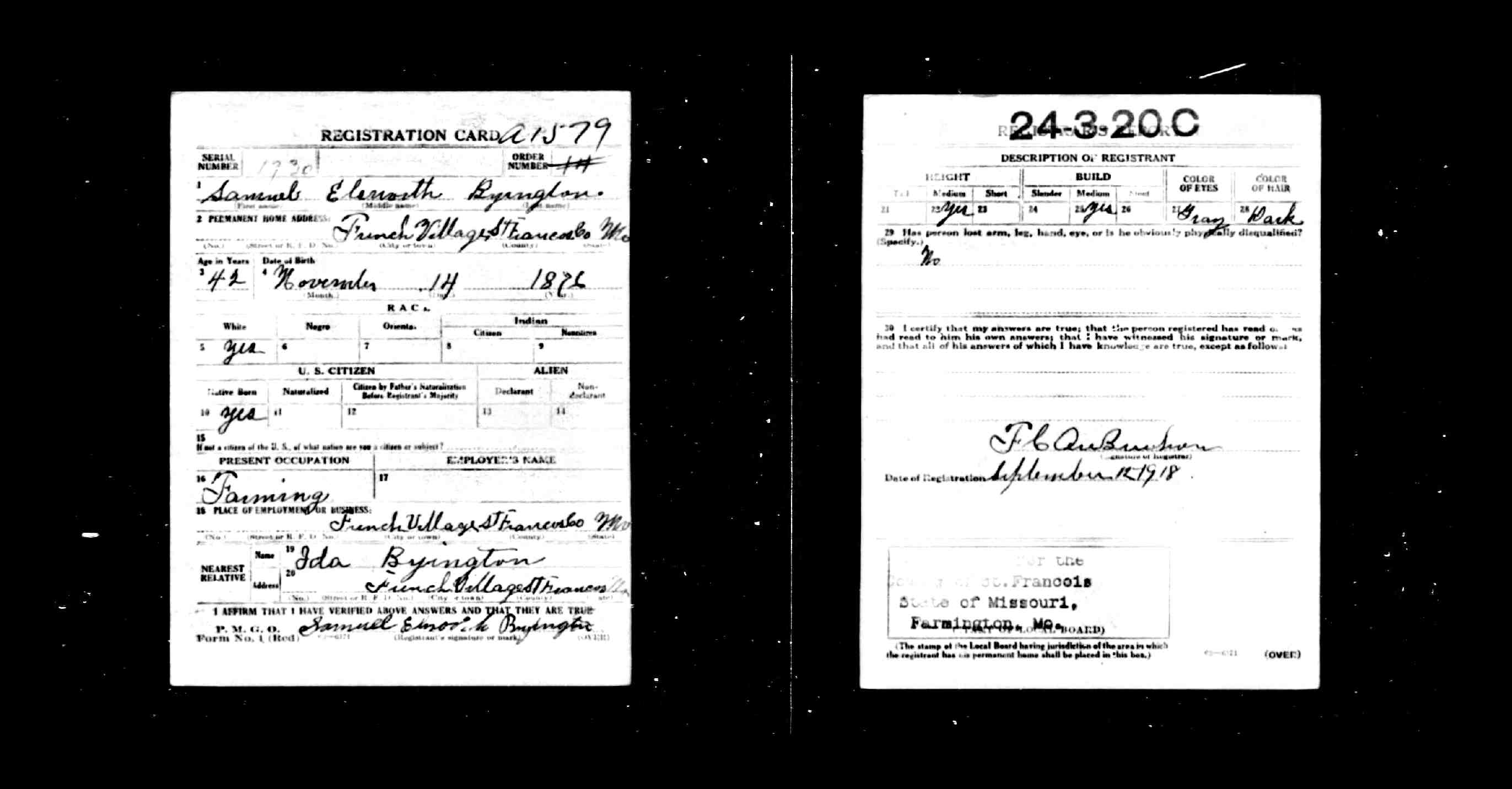 | Draft Registration | 12 Sep 1918 | Farmington, Saint Francois, St. Francois, Missouri, United States of America | ||||||||||||||||||||||||||||||||||||||||||||||||||||||||||||||||||||||||||||||||||||||||||||||||||||||||||||||||||||||||||||||||||||||||||||