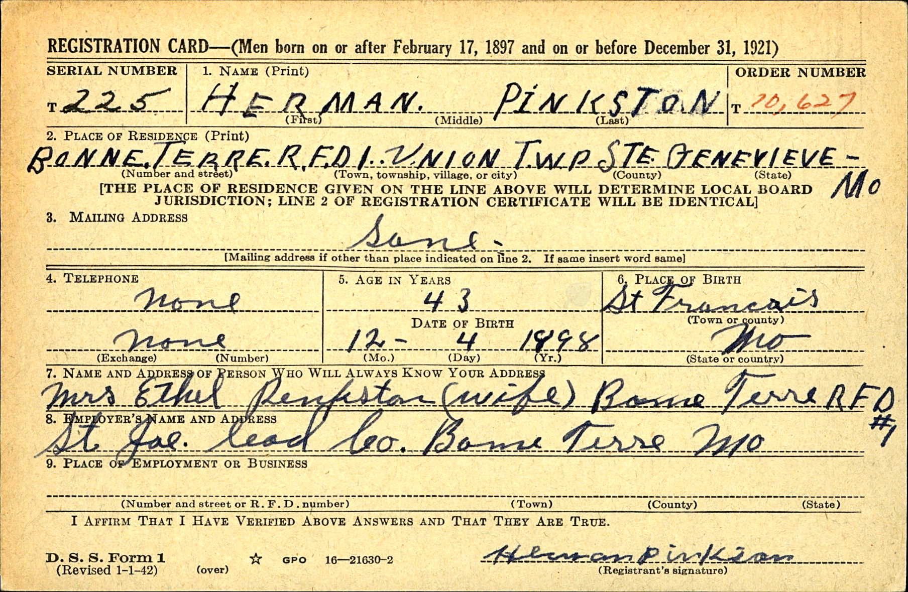 | Draft Registration | 16 Feb 1942 | Union, Ste. Genevieve, Missouri, United States of America | ||||||||||||||||||||||||||||||||||||||||||||||||||||||||||||||||||||||||||||||||||||||||||||||||||||||||||||||||||||||||||||||||||||||||||||||||||||||||||||||||||||||||||