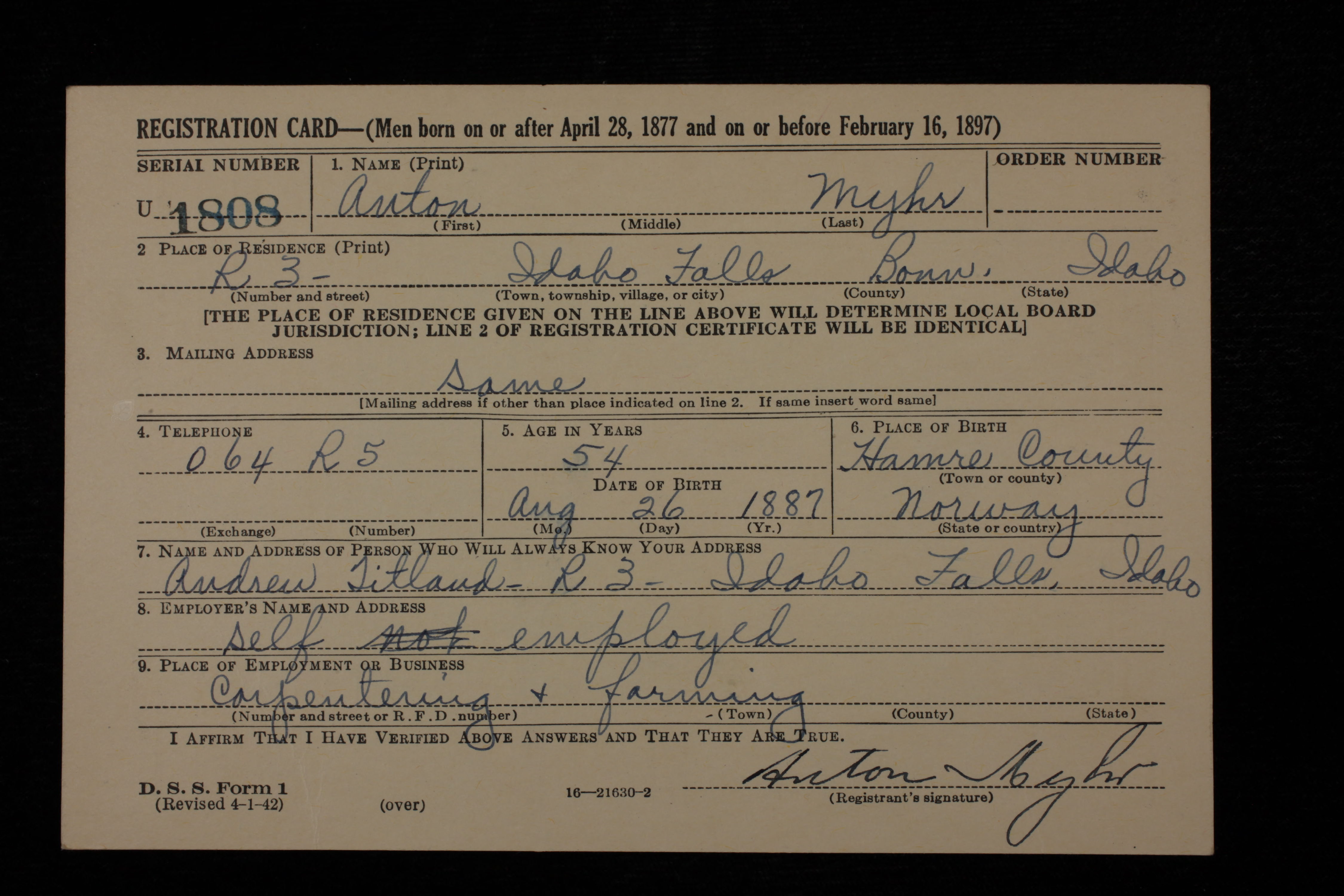 | Draft Registration | about 1942 | Idaho Falls, Bonneville, Idaho, United States of America | ||