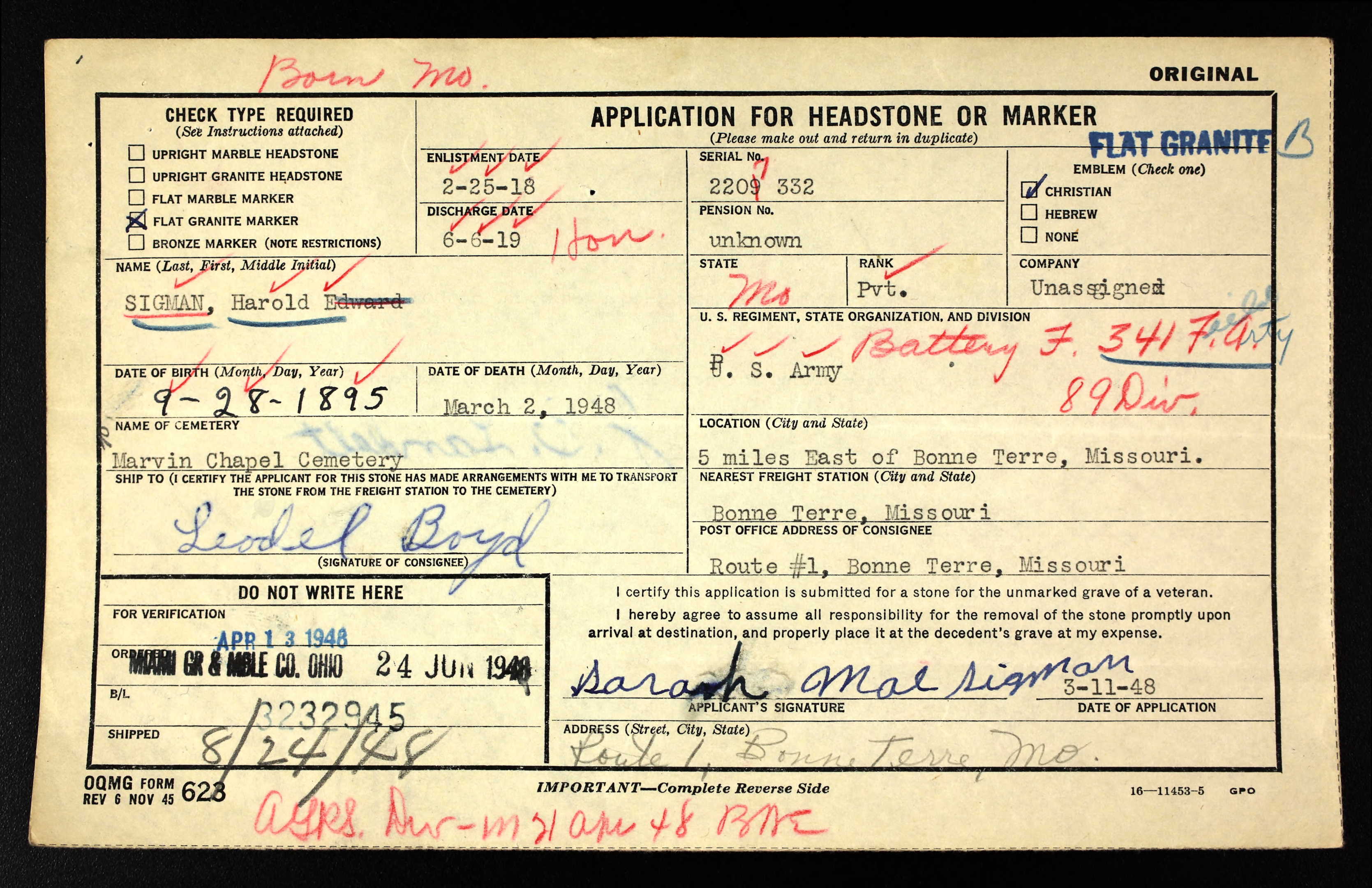| Sigman, Harold Edgar | 28 Sep 1895 | 2 Mar 1948 | ||