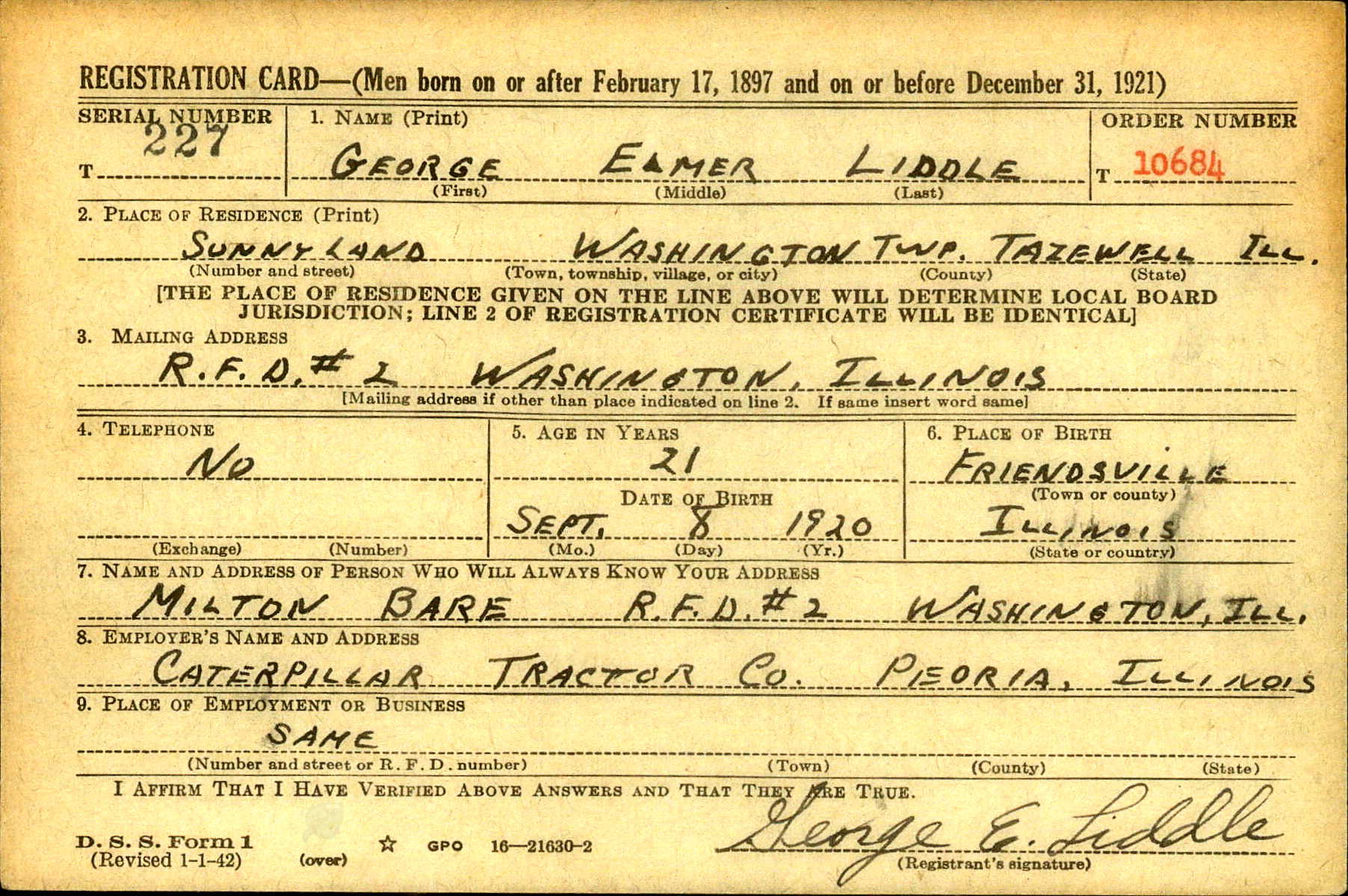 | Draft Registration | 16 Feb 1942 | Washington, Tazewell, Illinois, United States of America | ||