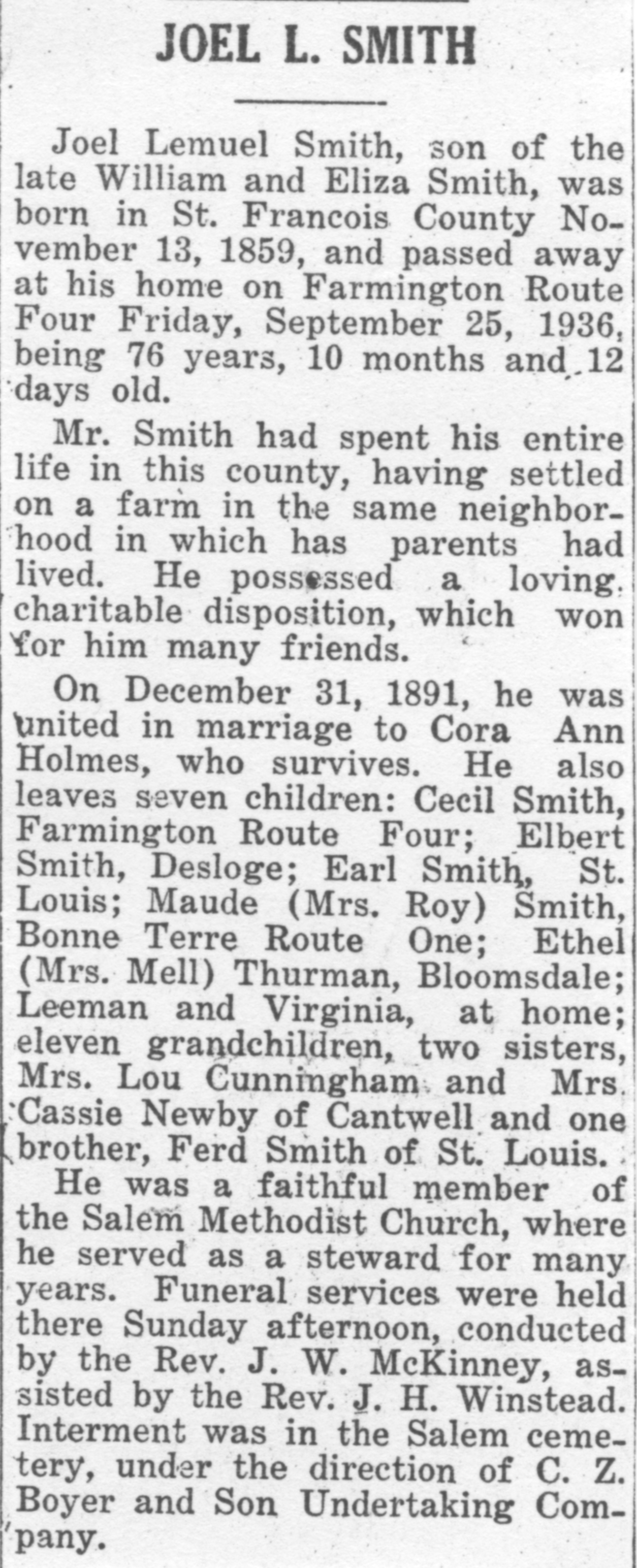 | Census | 15 Apr 1910 | Union, Ste. Genevieve, Missouri, United States of America | Joel L. Smith Household, 1910 Census | 6a | |||||||||||||||||||||||||||||||||||||||||||||||||||||||||||||||||||||||||||||||||||||||||||||||||||||||||||||||||||||||||||||||||||||||||||||||